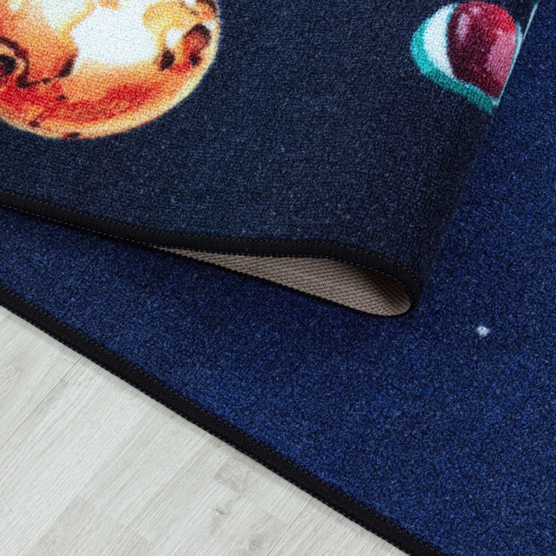 Tæppet fås i flere størrelser: 80×120, 100×150, 120×170, 140×200 og 160×230 cm, så det passer til både små og større børneværelser. Det blå astronaut gulvtæppe med tal er en dekorativ og funktionel løsning, der både opmuntrer til aktiv leg og læring i trygge rammer.
