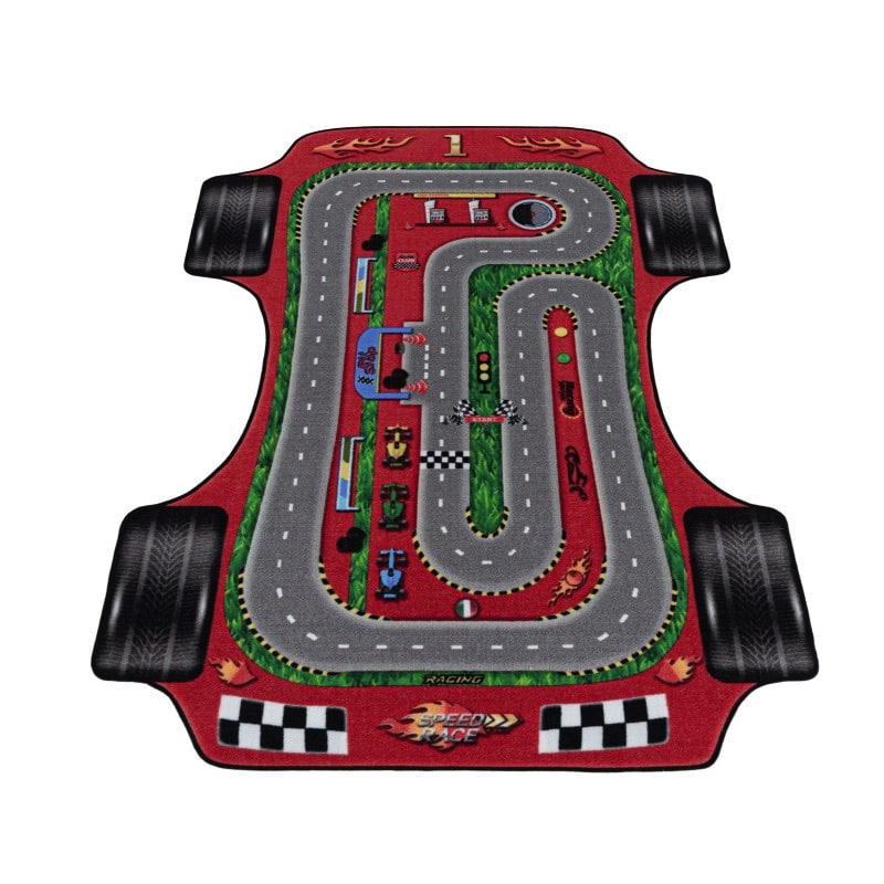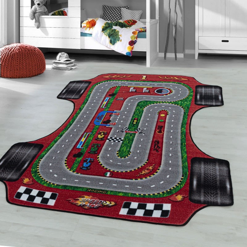 Rødt Racerbils Børne Gulvtæppe med Racerbane fra Rugs by Uniquebeds Home & Living | Flere Størrelser
