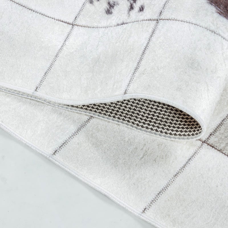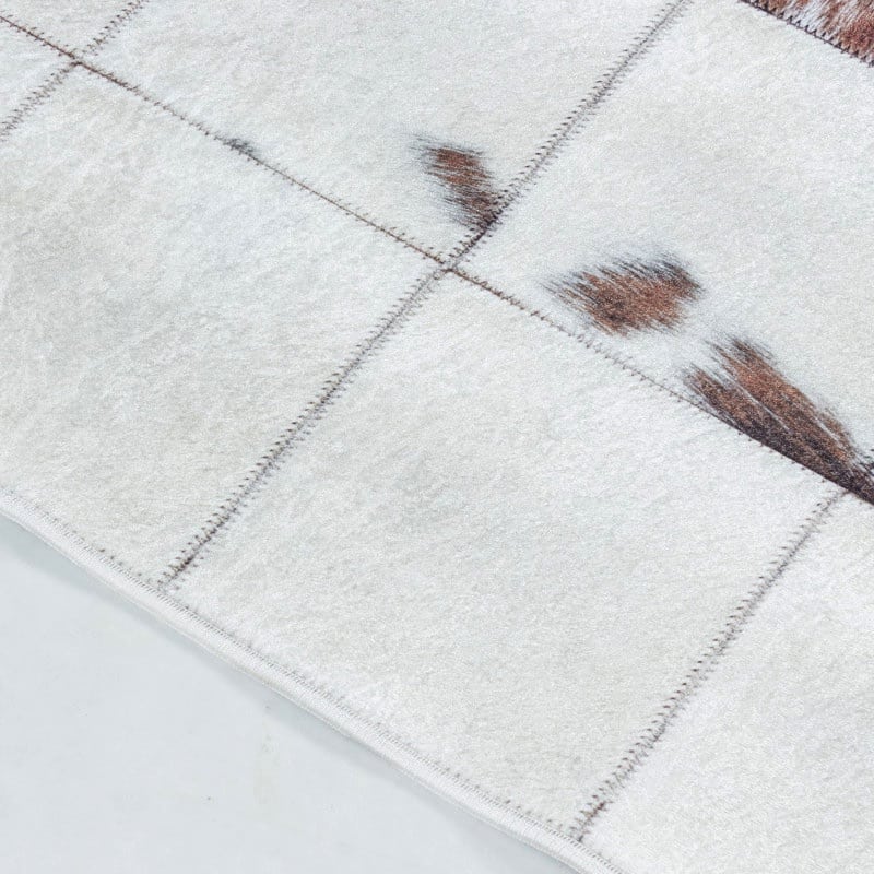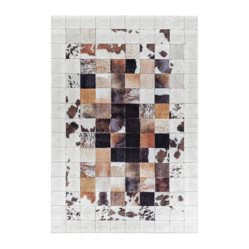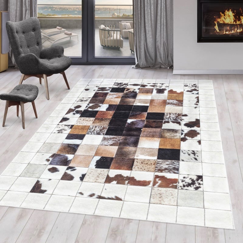 Med sit naturtro patchwork-design i kohuds-look er Hannah gulvtæppet et moderne og funktionelt valg, der giver hjemmet et stilfuldt og personligt udtryk.