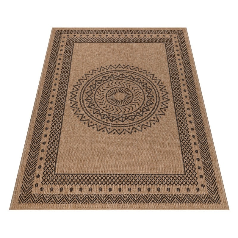Nancy gulvtæppet er et elegant og dekorativt valg til både indendørs og udendørs brug. Designet kombinerer en mønstret kant med et smukt, rundt mandalamønster i midten, hvilket giver tæppet et kunstnerisk og harmonisk udtryk. Du kan vælge mellem en variant i beige eller en udgave, hvor mønsteret er udført i sort, alt efter om du ønsker et roligt naturligt look eller et mere grafisk præg.