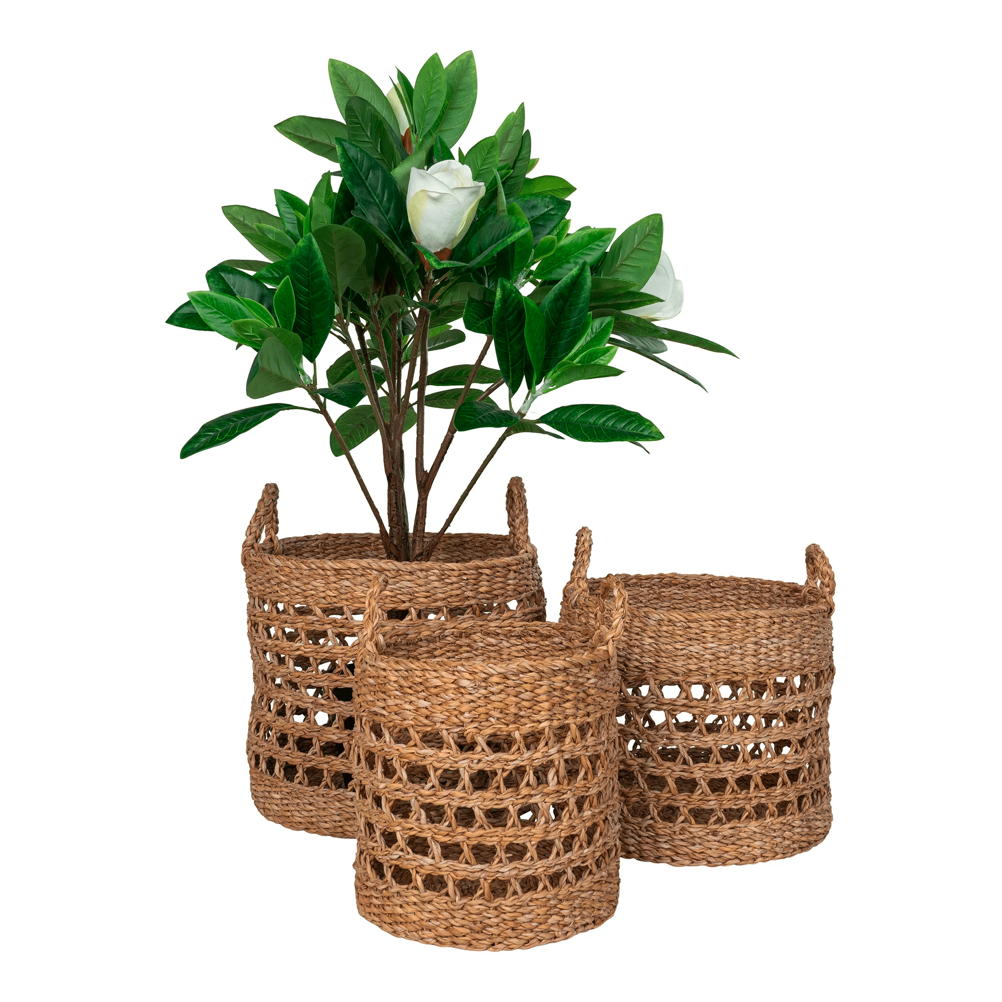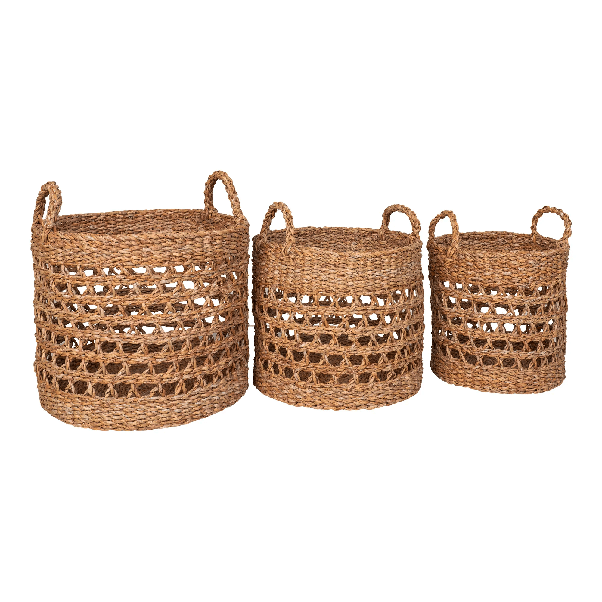 Balok kurvene fra House Nordic er et smukt sæt bestående af tre kurve, der er håndlavet af søgræs. Disse kurve kommer i forskellige størrelser, med målene Ø28×25 cm, Ø32×27 cm og Ø36×30 cm (Diameter x Højde). De tilbyder alsidig opbevaringsplads og kan bruges til at organisere alt fra tæpper og puder til bøger og legetøj. Takket være deres naturlige søgræs konstruktion tilføjer kurvene en rustik charme til ethvert rum. Placer dem i stuen, soveværelset eller gangen for at skabe en organiseret og indbydende atmosfære.