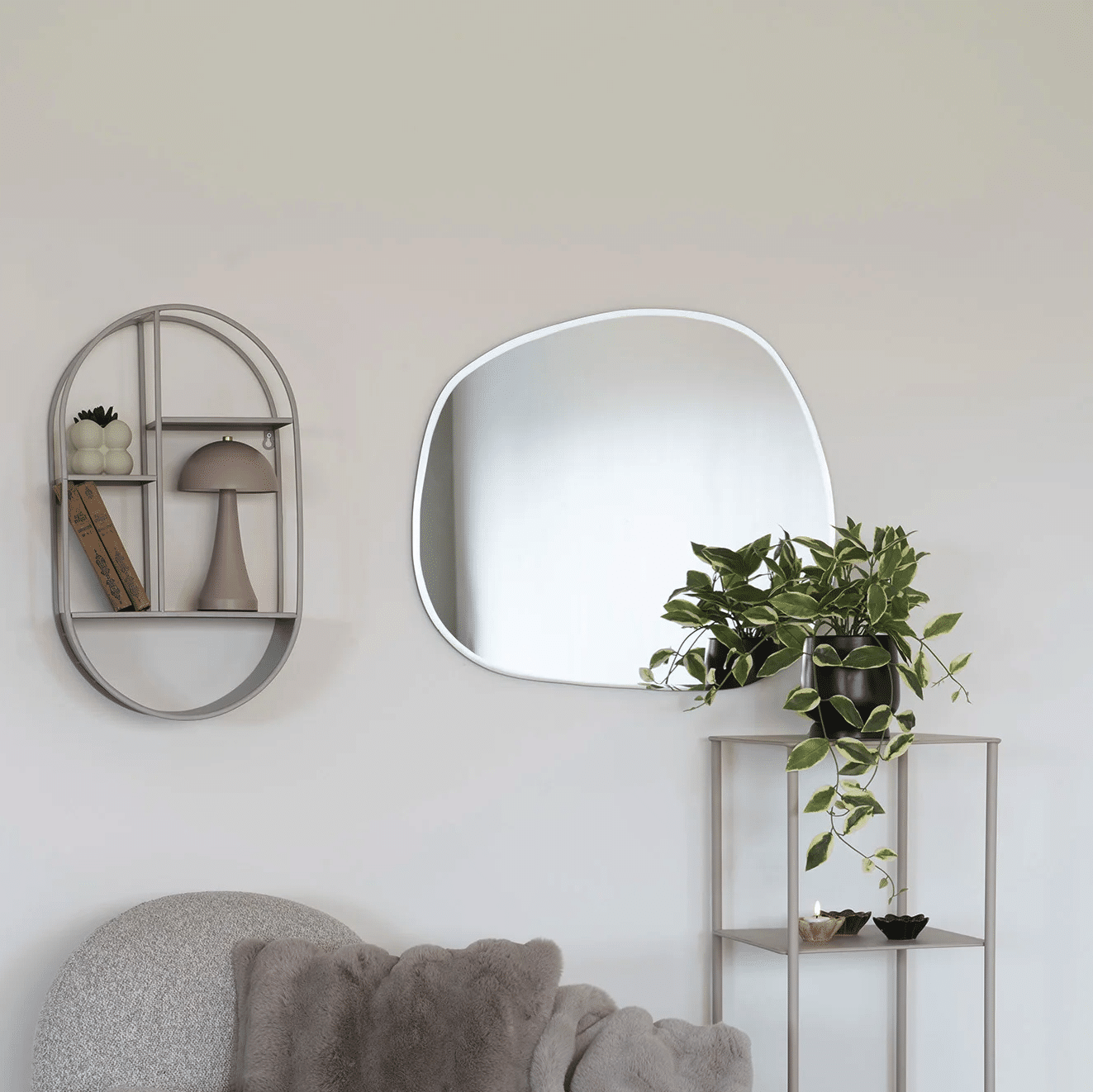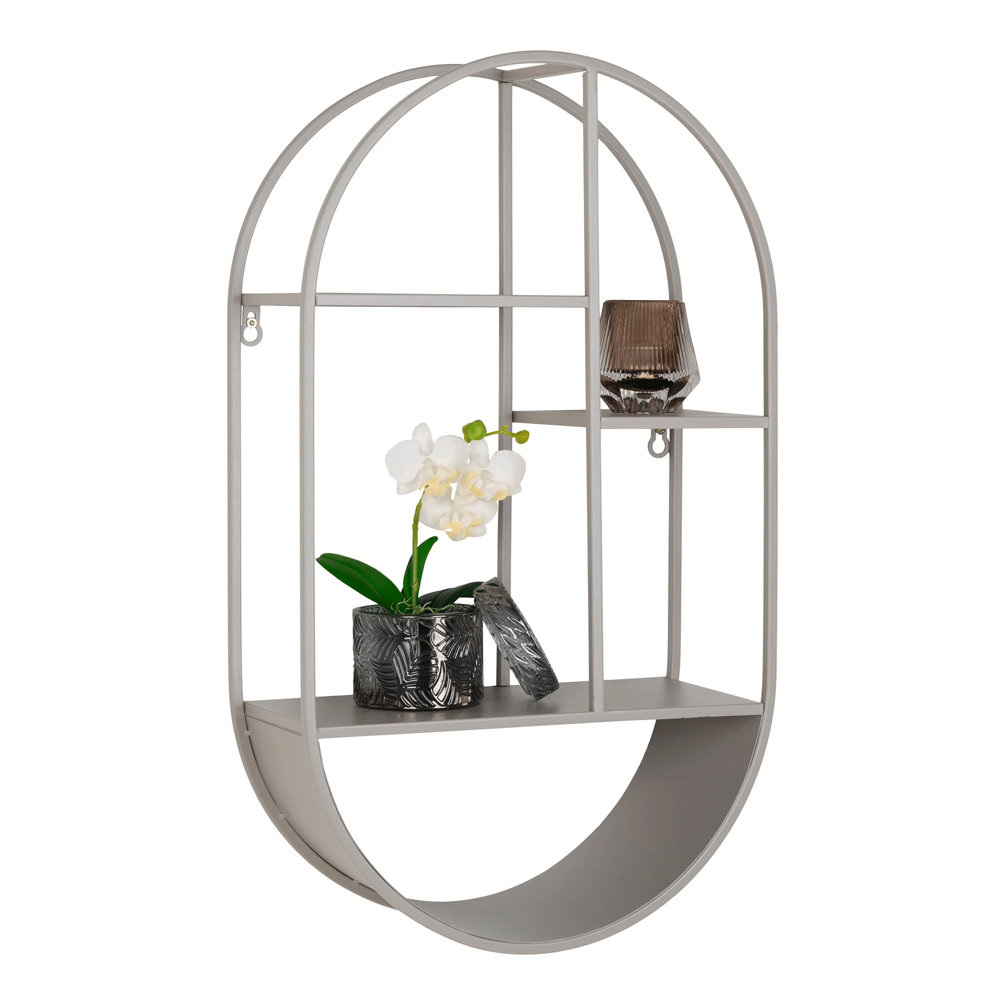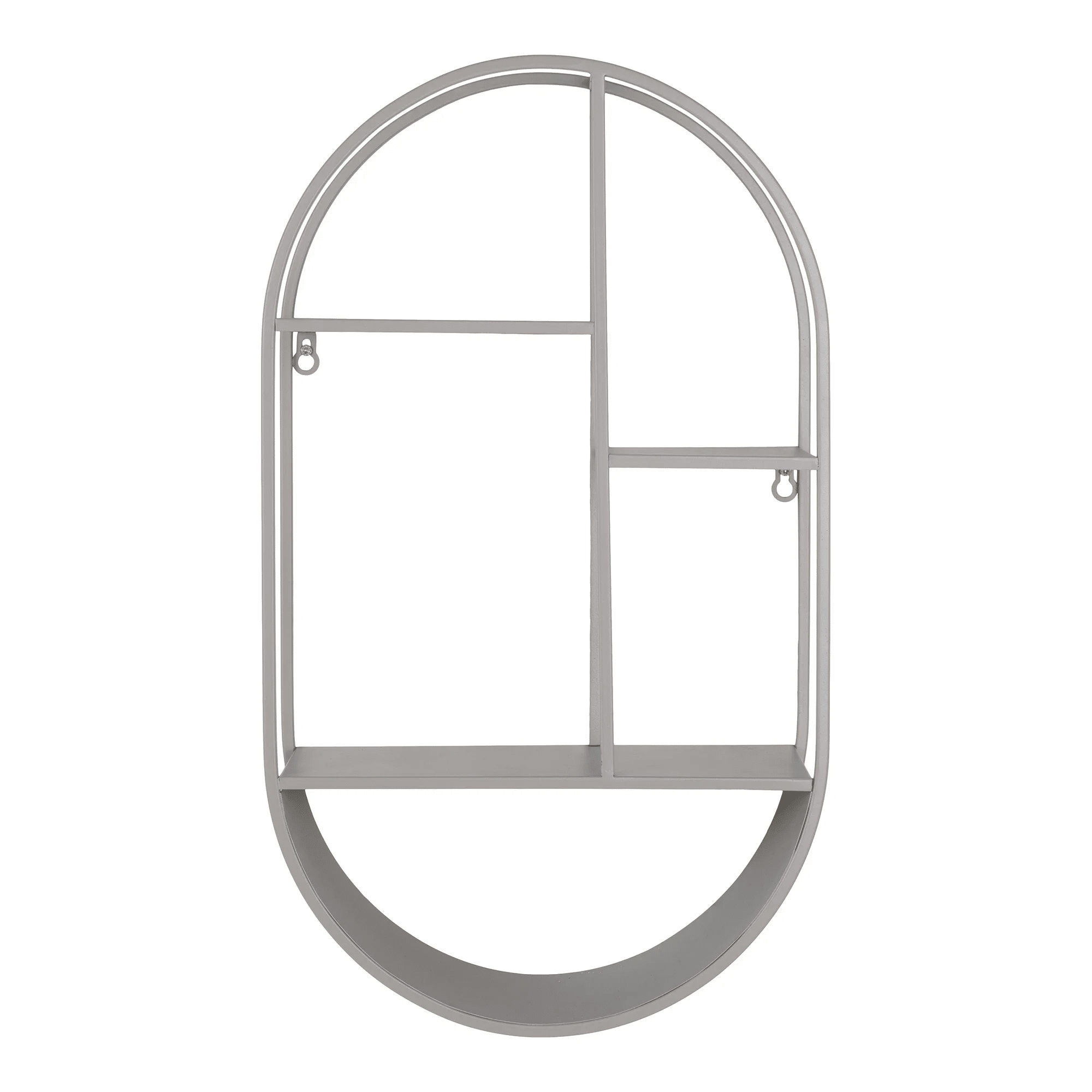 Det grå metalramme tilføjer et moderne touch til enhver indretning og passer perfekt til forskellige stilarter, fra industrielt til skandinavisk. Den ovale form tilføjer også et unikt præg og gør væghylden til et iøjnefaldende element på væggen.