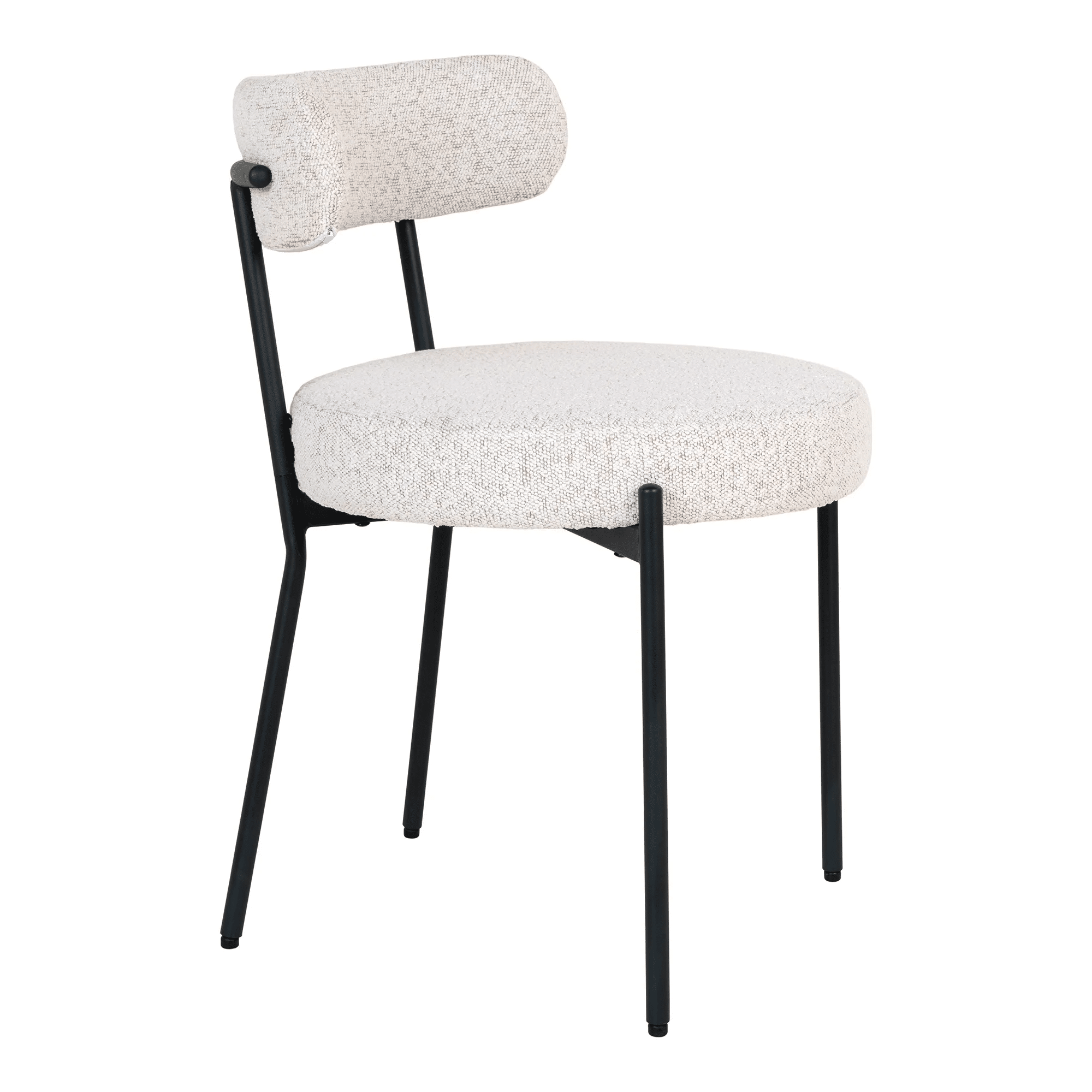 Den hvide bouclé polstring giver stolen et luksuriøst udseende og en behagelig siddeoplevelse. Den bløde tekstur og det smukke design skaber en indbydende atmosfære og tilføjer et sofistikeret præg til din indretning.