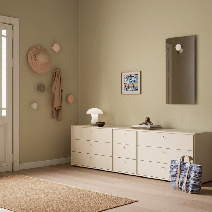 Med en bredde på 219,8 cm og en højde på 60,8 cm tilbyder skænken masser af plads til opbevaring. Den er opdelt i ni skuffer af to forskellige typer, der giver dig mulighed for at organisere dine ejendele effektivt. Skufferne er perfekte til både større og mindre ting, du ønsker at have lige ved hånden, og den store overflade giver plads til dekorationer eller medieudstyr. Modulet skal stå på ben og kan ved montering af hjul anvendes som bænk, med en maks. belastning på 150 kg.