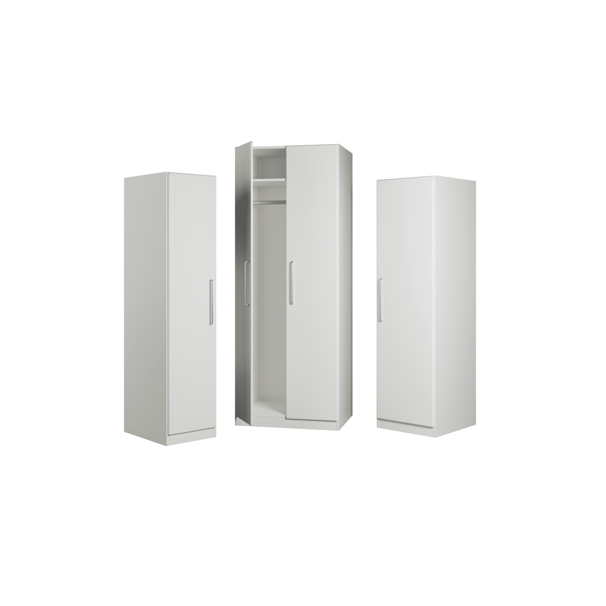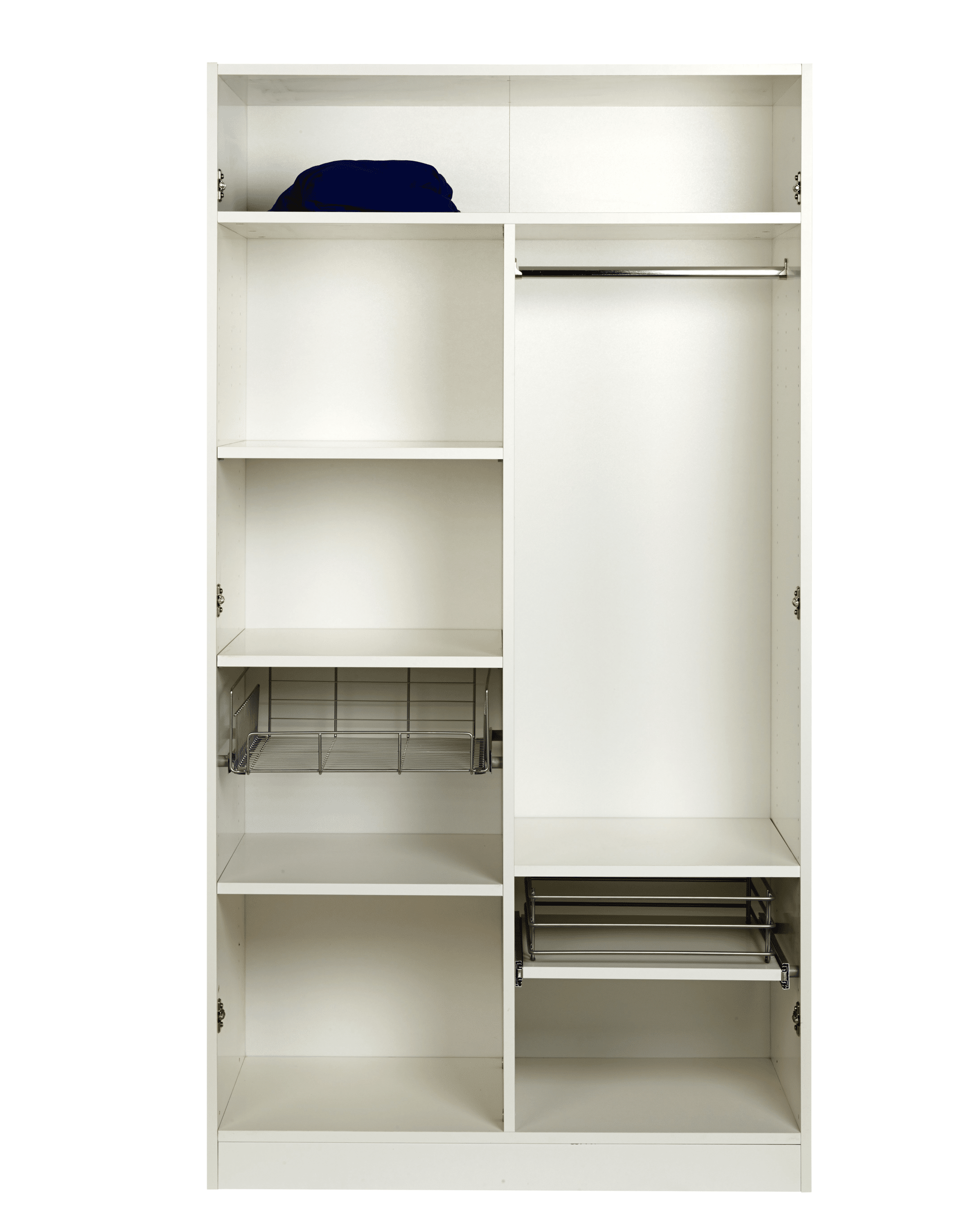 GrundSkabe leveres i en ren hvid farve, som passer ind i de fleste hjem og interiører. Hvert skab leveres med en bøjlestang og en fast hylde (den øverste hylde på billedet), hvilket giver en praktisk og organiseret opbevaringsløsning fra starten.