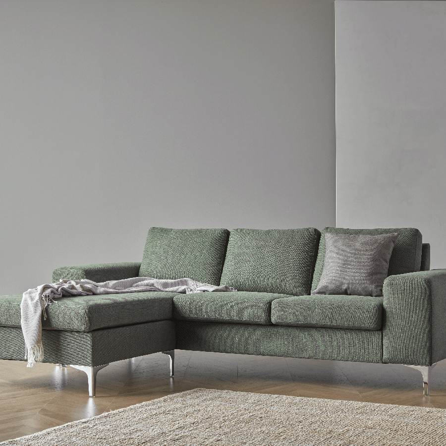De stilrene metalben fås i krom eller mat sort og understreger det elegante og lette design. Kombinationen af chaiselong og bredt sæde giver både komfort og fleksibilitet i dagligdagen.