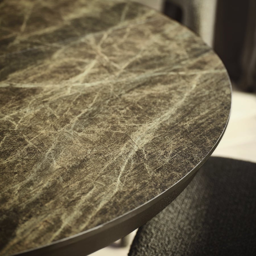Bordpladen har et flot marmorlook i smukke brune nuancer, som giver et luksuriøst og moderne udtryk uden at kræve den vedligeholdelse, der normalt følger med ægte marmor. Overfladen er slidstærk, nem at rengøre og tilfører rummet en elegant og harmonisk atmosfære. Stellet er udført i en dyb mørkebrun farve, som komplementerer bordpladens tone og skaber et helstøbt og afbalanceret udtryk.