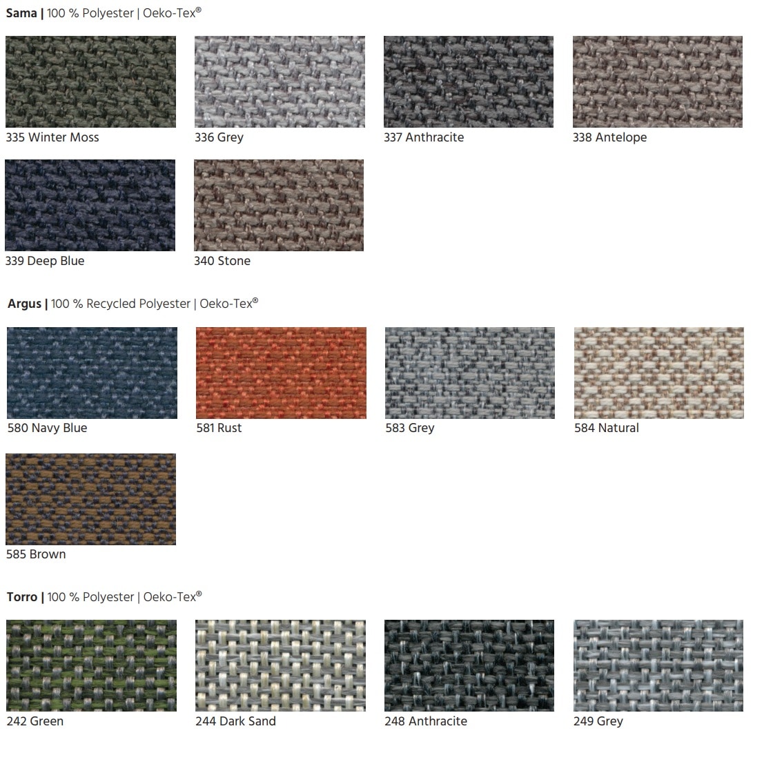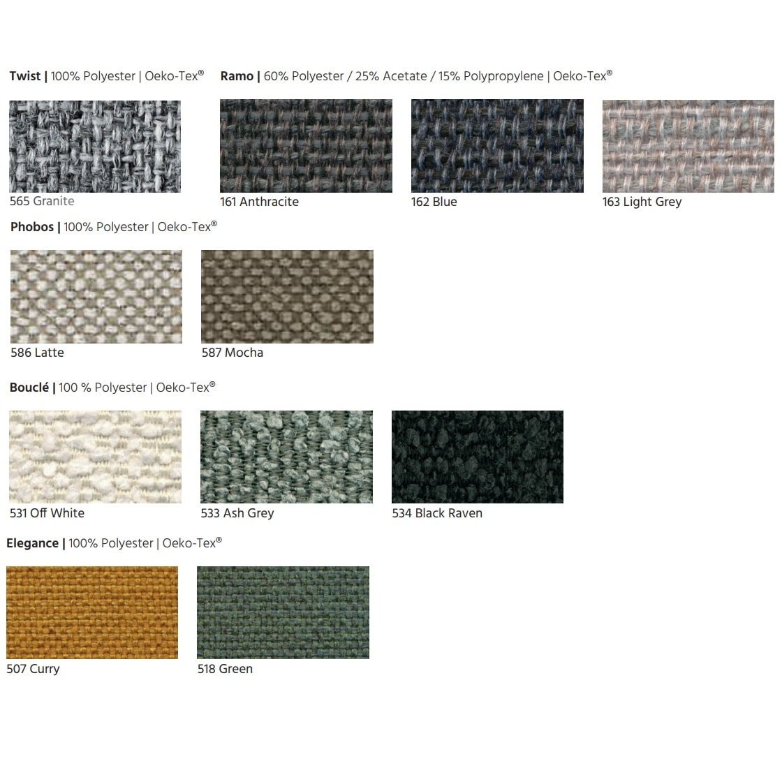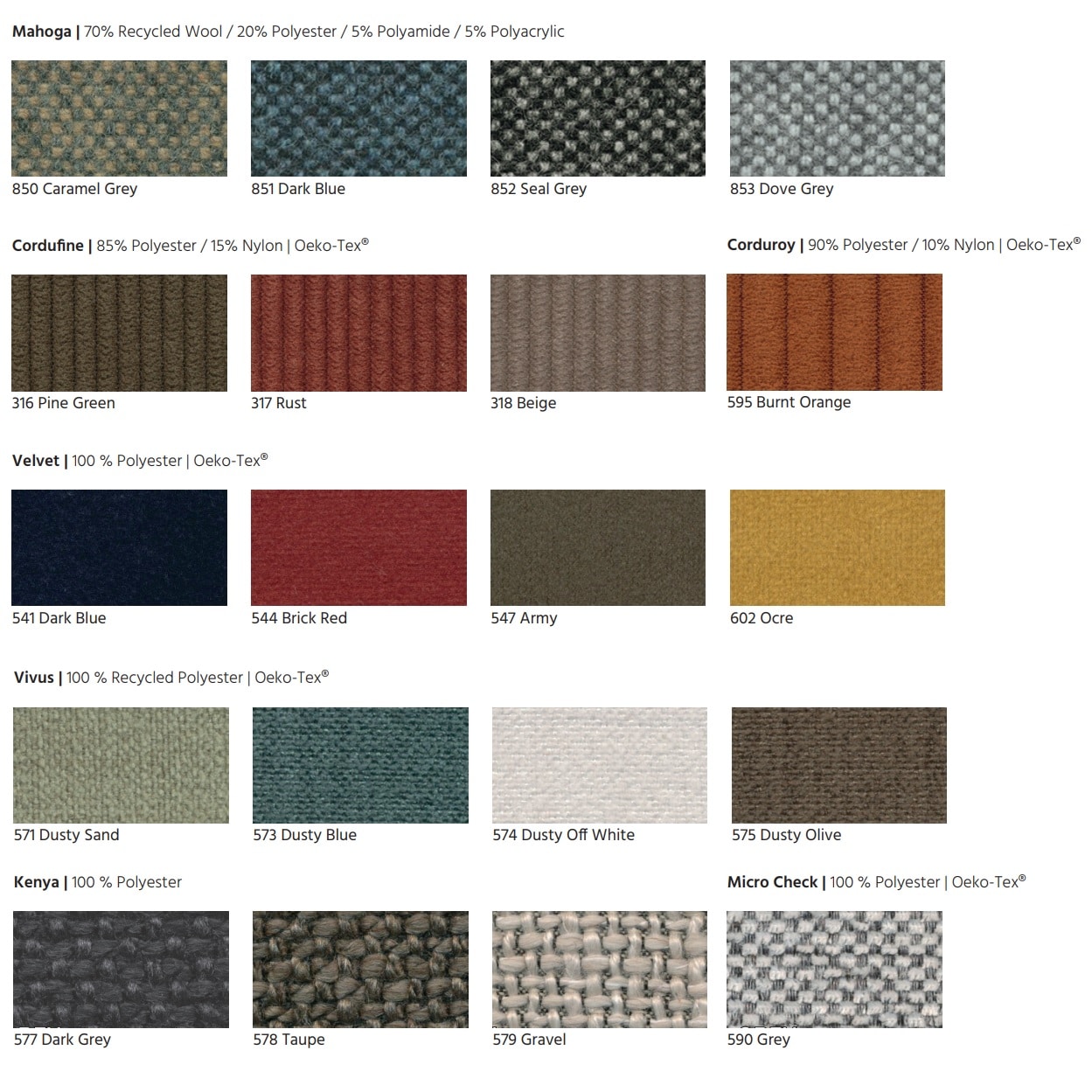 Mange af de tekstiler du kan vælge er OEKO-TEX-certificerede tekstiler lavet af 70-100 % genanvendte materialer fra genbrug eller overskud fra industrien