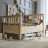 Agnes Snedker sengeramme med klassisk gavl og hegn fra Raw Kids er et elegant og robust skandinavisk design, der kombinerer funktionalitet med smukke, naturlige materialer. Sengen er håndlavet i 100 % massivt fyrretræ, limet for ekstra holdbarhed og uden knaster, hvilket sikrer en holdbar og flot seng uden revner eller fejl.