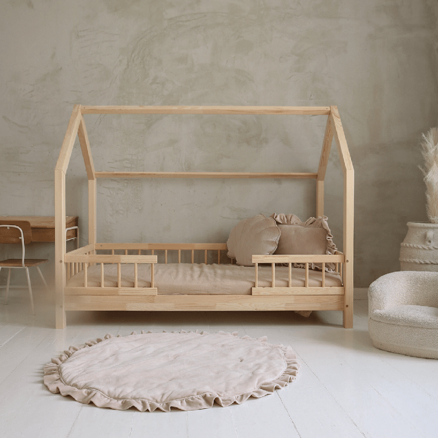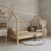 Alberte Duo Snedker husseng fra Raw Kids er en håndlavet børneseng i 100 % massivt fyrretræ – skabt med dobbelte front-sengeheste og et legende, arkitektonisk formsprog. Mini-tagkonstruktionen i kombination med runde tremmer skaber tryghed og giver barnet sit eget lille hus i soveværelset.