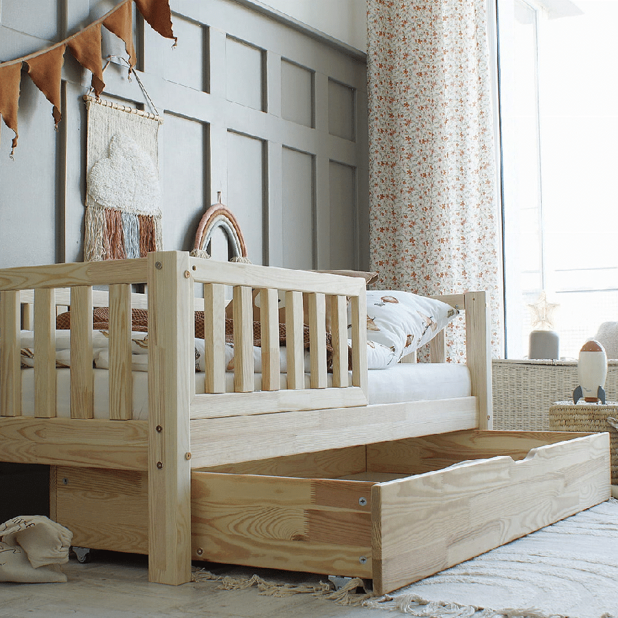 Anna sengeramme i træ med skuffe og firkantet sengehest er en stilren børneseng i skandinavisk design, tilgængelig i flere størrelser: 60×120, 70×140, 70×160 og 90×200 cm.