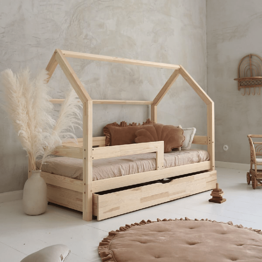 Alma Snedker Husseng Håndlavet i 100% Massiv Fyrretræ med Skuffe og Simpel Sengehest fra Raw Kids | Flere Størrelser