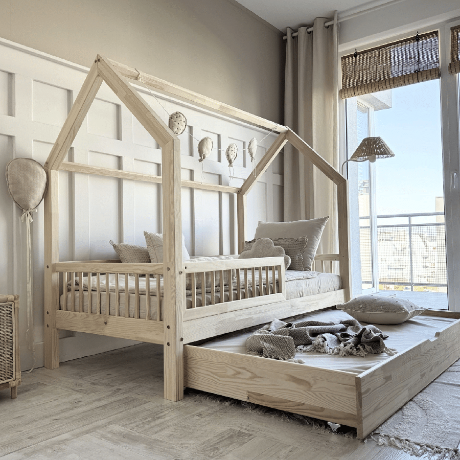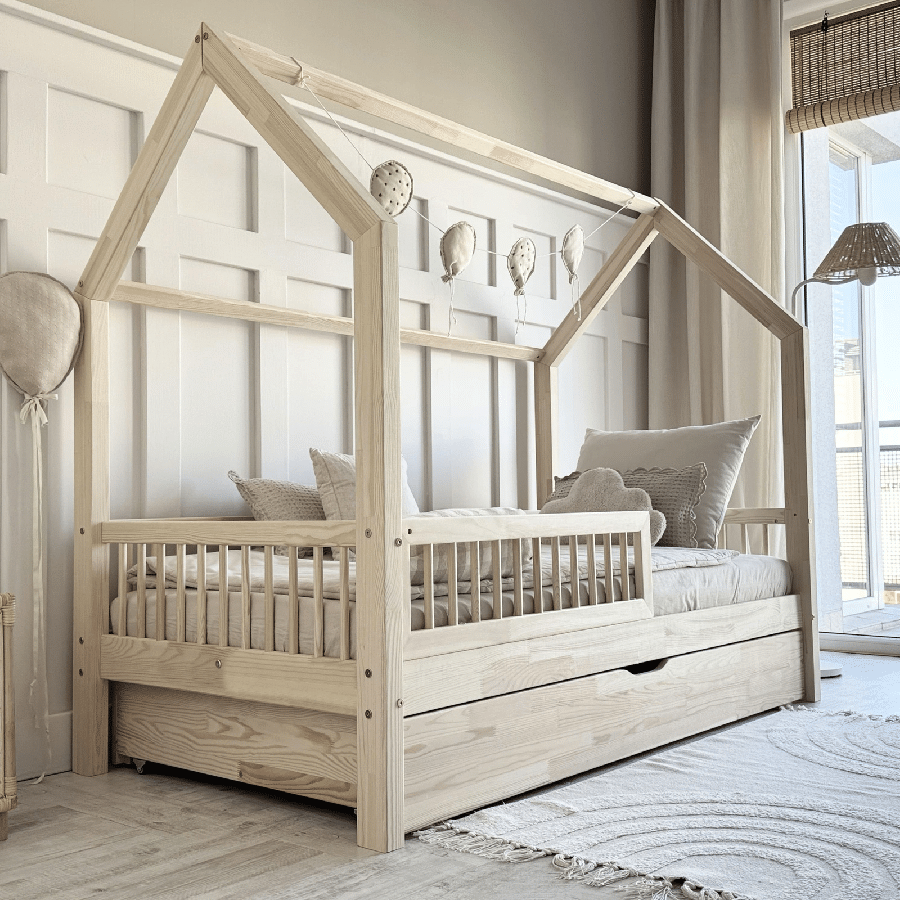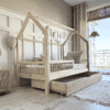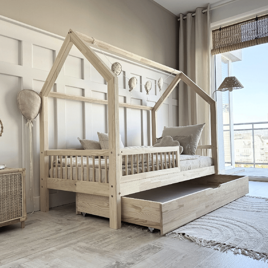 Ellie Snedker Husseng Håndlavet i 100% Massiv Fyrretræ Med Skuffe & Rund Sengehest fra Raw Kids | Flere Størrelser