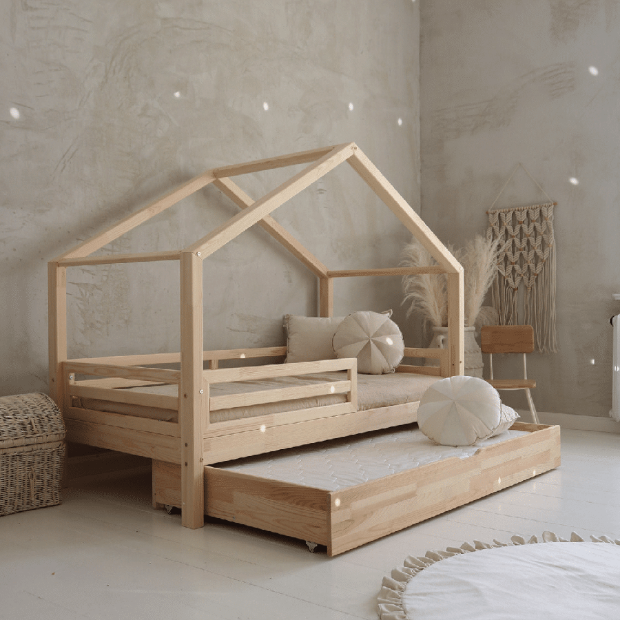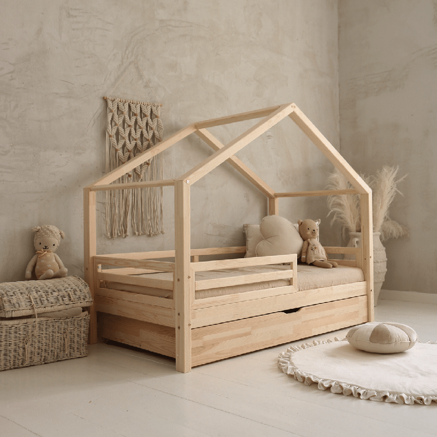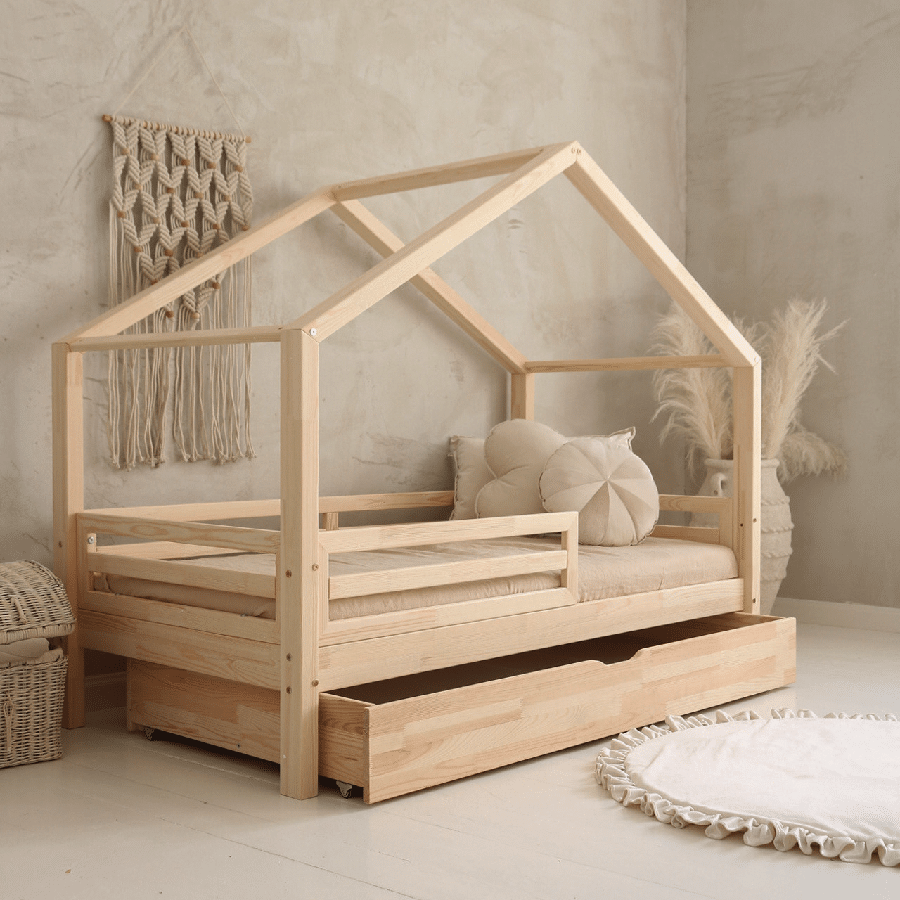 Alma Snedker Husseng Håndlavet i 100% Massiv Fyrretræ med Skuffe og Rund Sengehest fra Raw Kids | Flere Størrelser