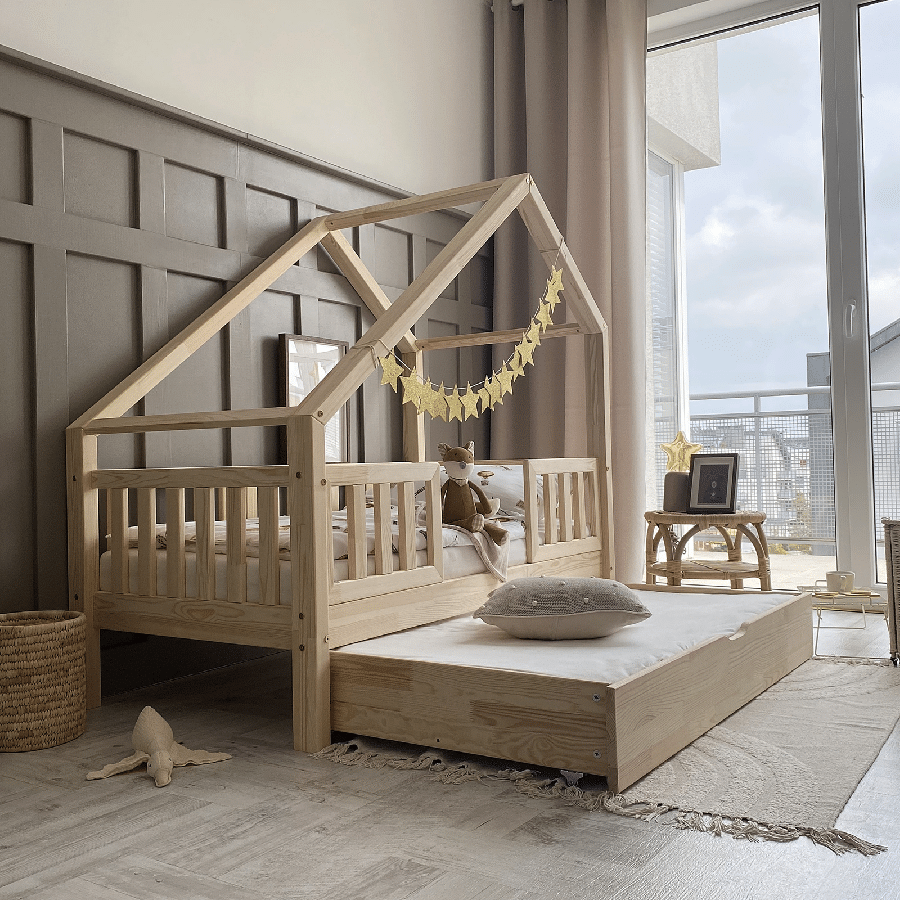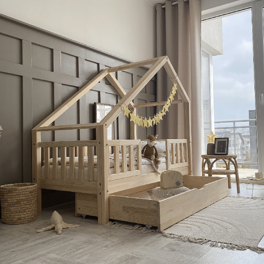 Lærke Duo Snedker Husseng med skuffe og klassisk sengehest fra Raw Kids er en stilfuld og praktisk børneseng i massivt fyrretræ, håndlavet med fokus på kvalitet og skandinavisk design. Sengen har en karakteristisk tagform med stakittet sengehest, der skaber en tryg og hyggelig atmosfære for dit barn.