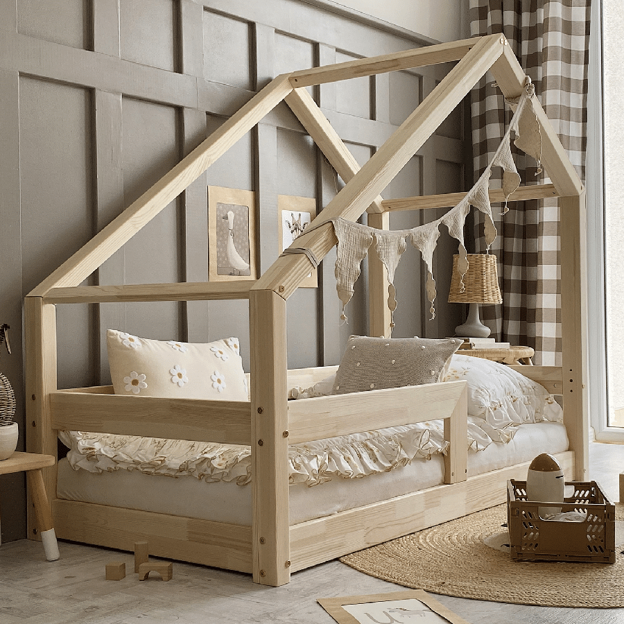 Træet er slebet glat og har afrundede kanter, hvilket sikrer en tryg oplevelse for både børn og forældre. Den simple sengehest måler ca. 25 cm i højden og efterlader en indgang ved den lange tagbjælke. Ønsker du mere sikkerhed, kan frontskinnen udvides til 2/3 af sengens længde.