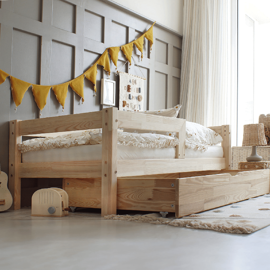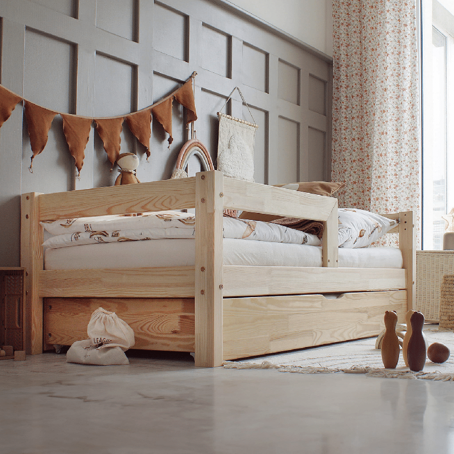 Laura Snedker Sengeramme Håndlavet i 100% Massiv Fyrretræ med Skuffe & Simpel Sengehest fra Raw Kids | Flere Størrelser