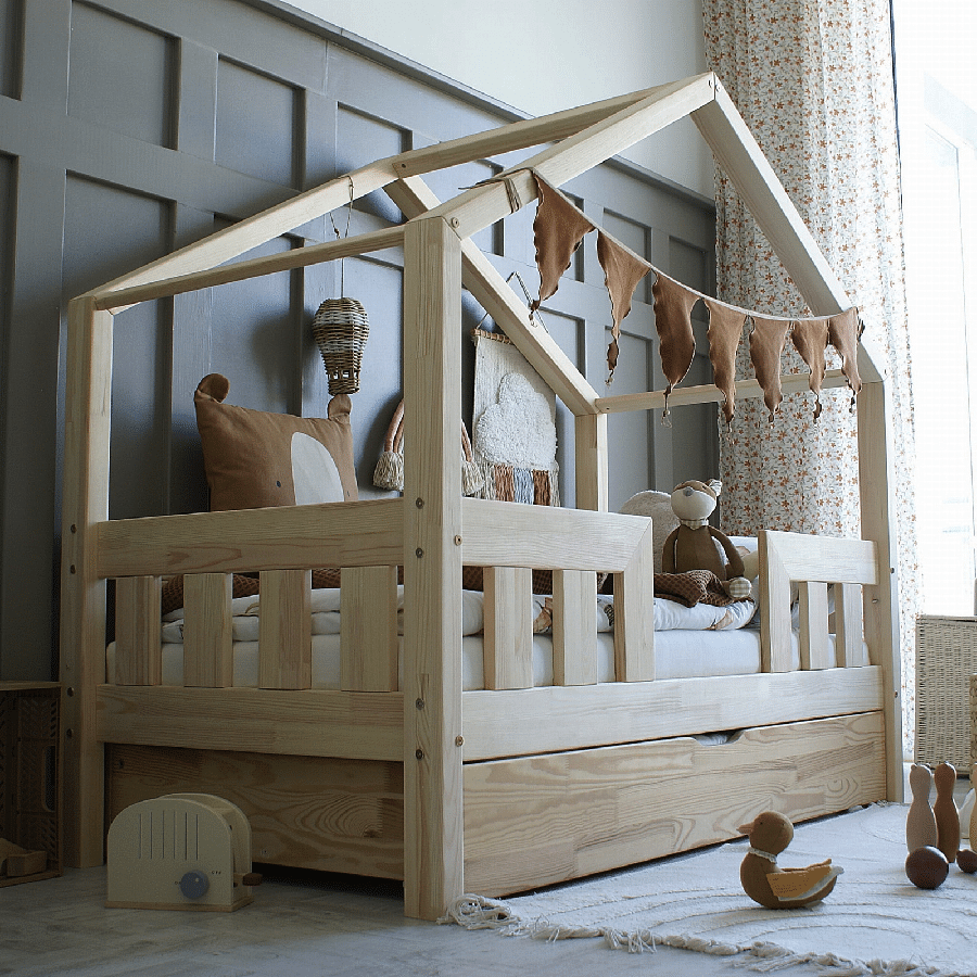 Lily Duo Snedker Husseng Håndlavet i 100% Massiv Fyrretræ med Skuffe og Simpel Klassisk Sengehest fra Raw Kids | Flere Størrelser