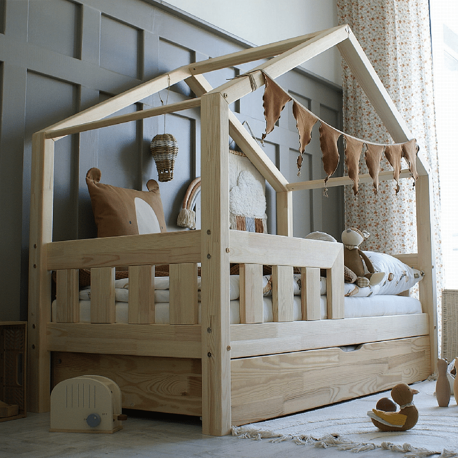 Lily Snedker Husseng Håndlavet i 100% Massiv Fyrretræ med Skuffe og Simpel Klassisk Sengehest fra Raw Kids | Flere Størrelser