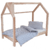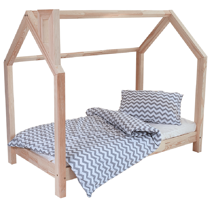 Sengen leveres med en robust lamelbund, der monteres med de medfølgende skruer. Den unikke husseng har lodrette bjælker med en højde på 90 cm og et mini-tag, der giver en hyggelig atmosfære. Den samlede højde varierer efter bredde fra 125 cm til 140 cm. Standardbenenes højde er 10 cm, men kan opgraderes til 19 cm ved valg af skuffe.