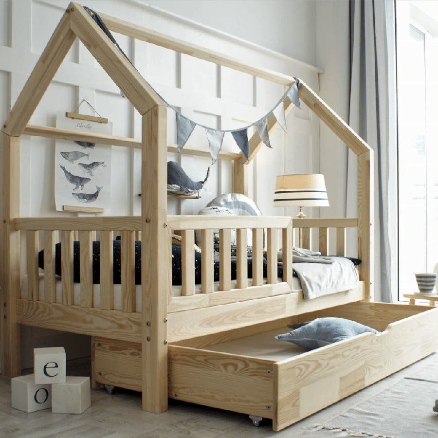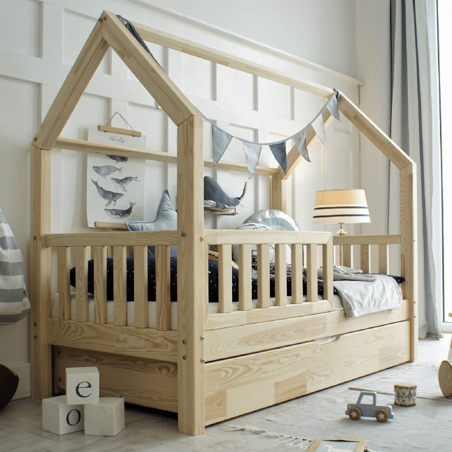 Olivia Snedker Husseng Håndlavet i 100% Massiv Fyrretræ med Skuffe og Klassisk Sengehest fra Raw Kids | Flere Størrelser
