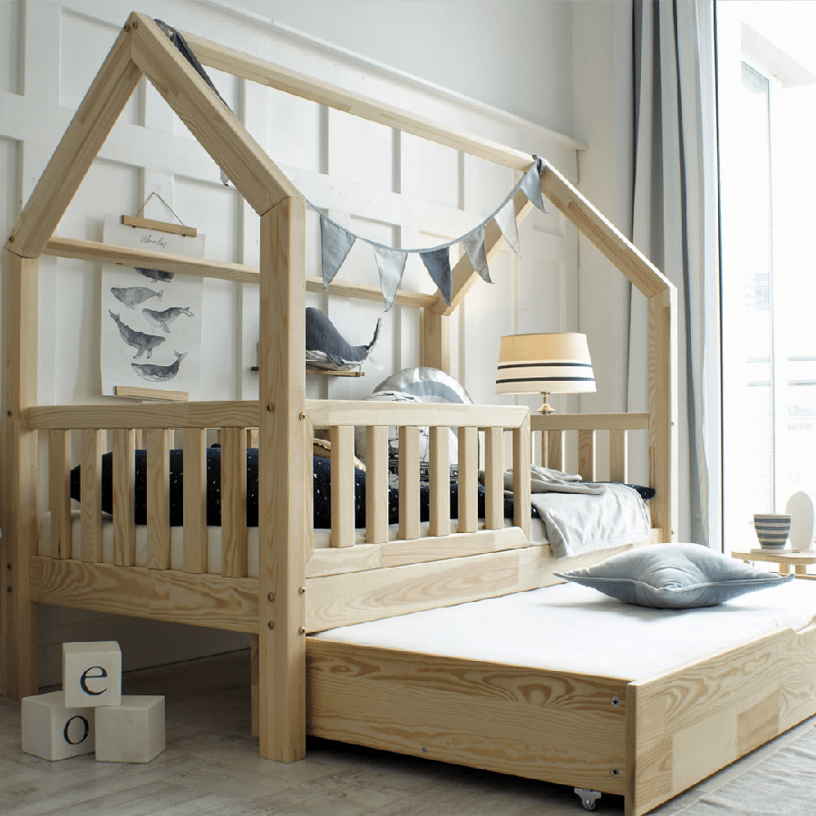 Alma Duo Snedker Husseng Håndlavet i 100% Massiv Fyrretræ med Skuffe og Simpel Sengehest fra Raw Kids | Flere Størrelser