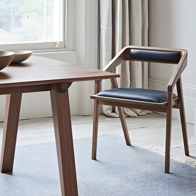 Massiv valnød er kendt for sin dybe farve, varme glød og levende årer, der gør hver stol unik. Træet kan olieres for at bevare nuancerne og let genbehandles, hvis du ønsker at opfriske overfladen eller ændre udtrykket med en ny finish.