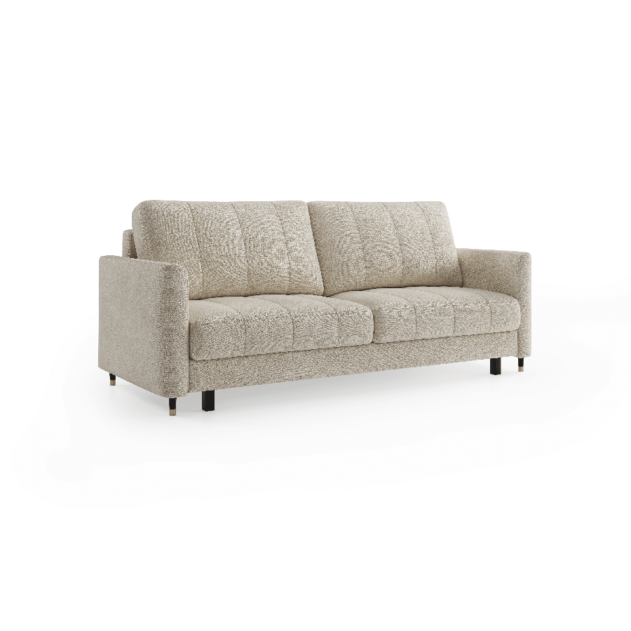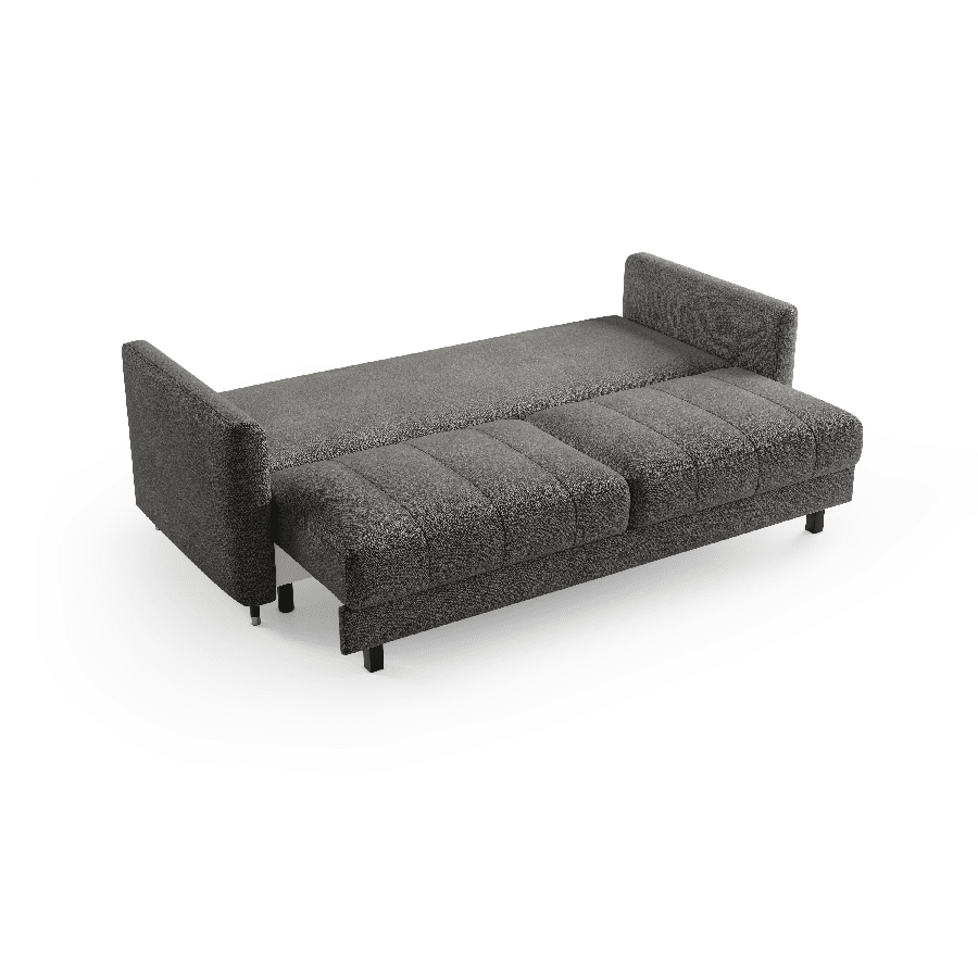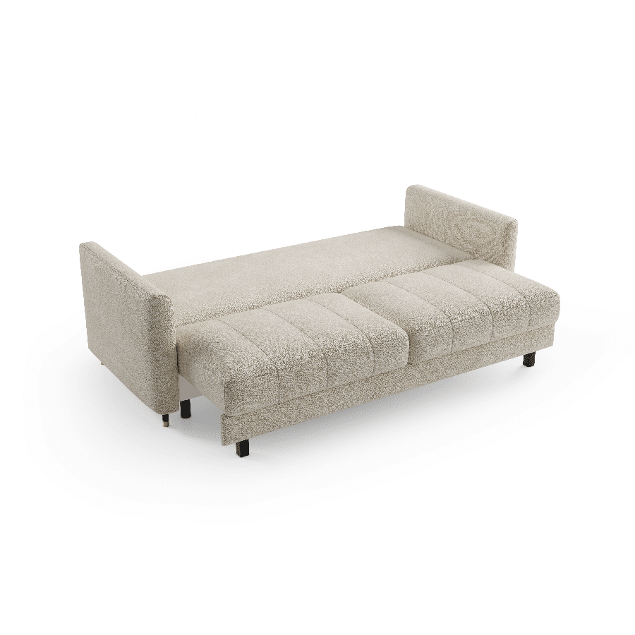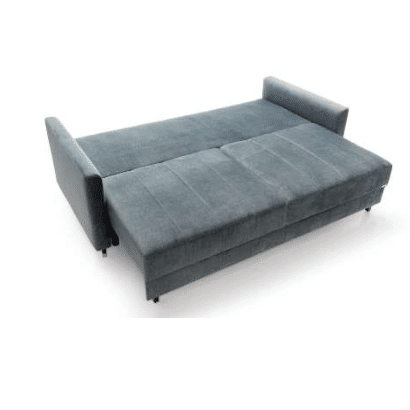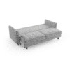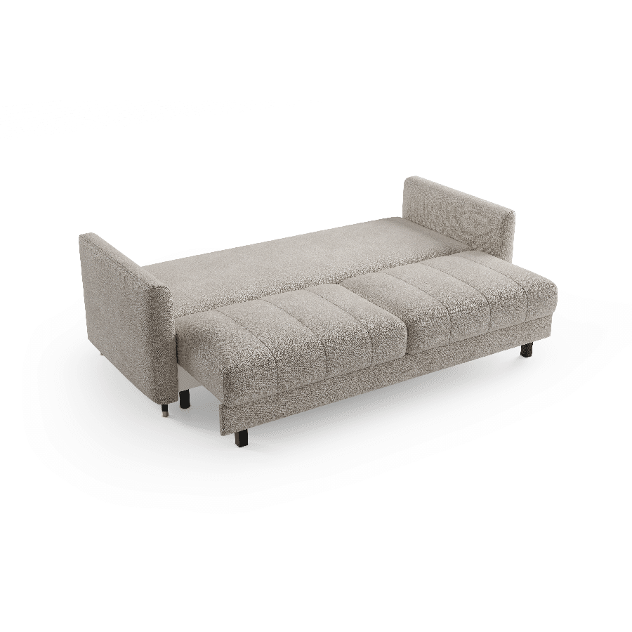 Sædet er desuden fyldt med højelastisk skum, som giver optimal støtte og reducerer risikoen for deformation. Hynderne har en kerne af polyurethan-silikone og er inddelt i rum, så de bevarer form og komfort over tid. Sofaen rummer et stort og praktisk opbevaringsrum, perfekt til dyner, puder eller andet tilbehør. Den automatiske sovefunktion aktiveres nemt og uden brug af kræfter – mekanismen beskytter samtidig gulvet mod ridser.